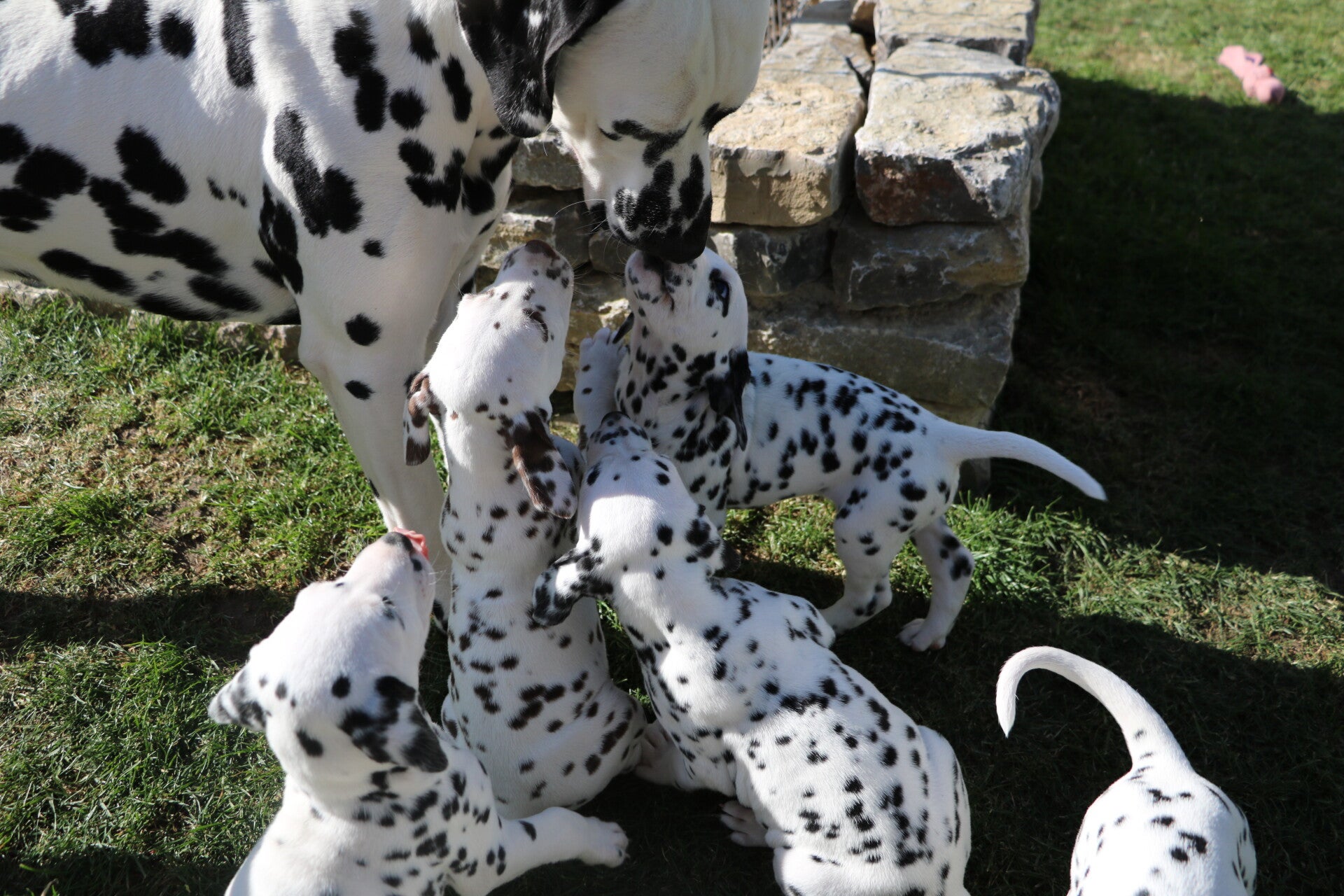4 Hündinnen weiß-schwarz (Halsband rot Ulani, grün Ulaika, gelb Unica, sowie lila Undri (Monokel)