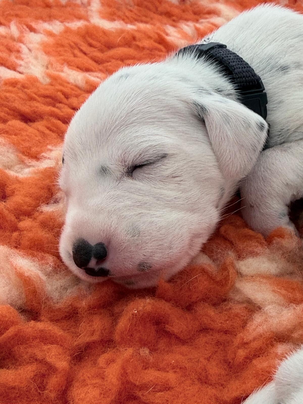 4 Hündinnen weiß-schwarz (Halsband rot, grün, gelb, sowie lila(Monokel)